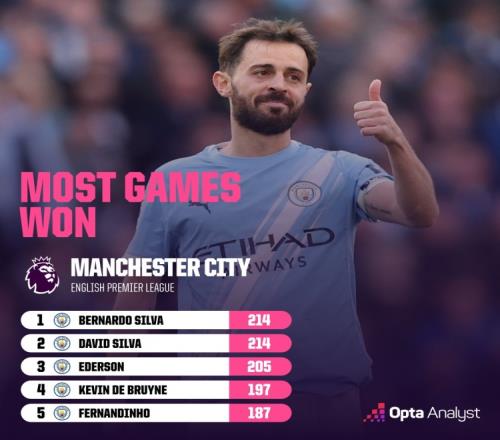 214場!曼城球員英超勝場數(shù):B席追平大衛(wèi)席爾瓦并列隊史榜首