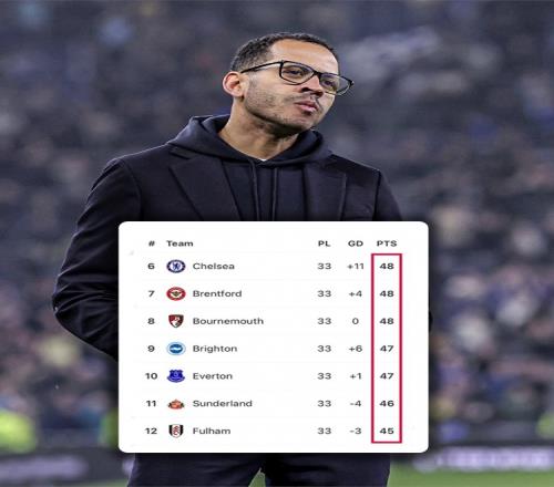 在英超積分榜上,切爾西以48分位居第6,但僅僅領(lǐng)先位居第12的富勒姆3分,而且布倫特福德和伯恩茅斯和藍軍積分相同。