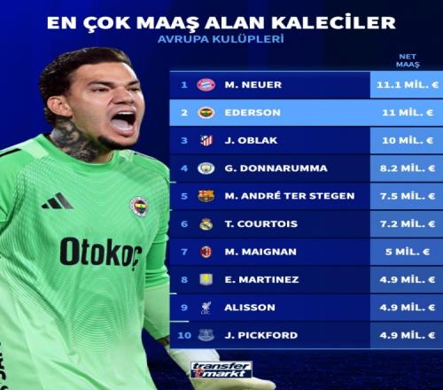 德轉(zhuǎn)列歐洲俱樂部門將凈年薪:諾伊爾1110萬歐第一,埃德松第二