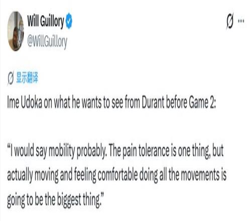 烏度卡談及杜蘭特在G2前需要達到的狀態(tài):“我覺得關鍵還是移動能力。疼痛耐受度是一方面,但能否順暢跑動、完成所有動作且體感無不適,才是最重要的?!?/p>