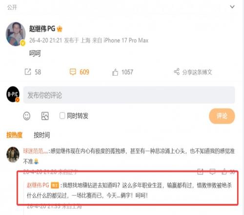 賽后,趙繼偉在社媒上發(fā)文寫(xiě)道:“呵呵。”