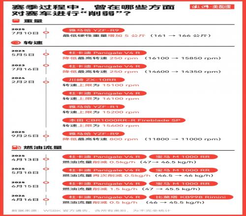 例如在2025賽季SBK賽事中,杜卡迪與寶馬優(yōu)勢(shì)過(guò)于突出,F(xiàn)IM在荷蘭站先將兩車廠賽車燃油流量下調(diào)0.5千克/小時(shí),卻未能壓制其競(jìng)爭(zhēng)力,仍有不少車手抱怨杜卡迪性能過(guò)于激進(jìn)。后續(xù)比賽中,二者仍包攬三連勝,F(xiàn)IM再度下調(diào)其燃油流量1.0千克/小時(shí),累計(jì)降幅達(dá)1.5千克/小時(shí)。同年西班牙阿拉貢賽前,雅馬哈R9也因多場(chǎng)連勝被增重5千克,轉(zhuǎn)速上限被限制在11500轉(zhuǎn)。