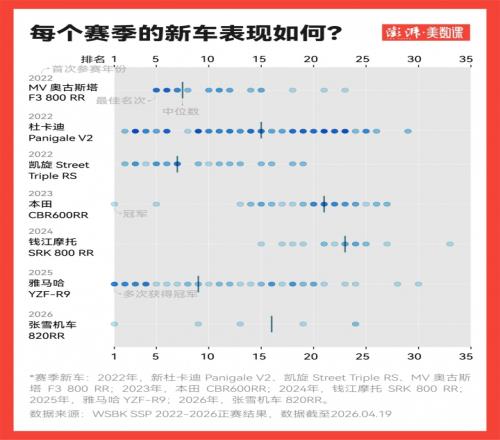 新規(guī)公布后,杜卡迪、凱旋、MV奧古斯塔加入新賽季角逐,他們的首次參賽賽季最佳成績(jī)依次為:2 次亞軍、2次亞軍、7次第五名。自2022年新規(guī)以來(lái),賽季新車只有本田、雅馬哈、張雪機(jī)車出場(chǎng)即奪冠。