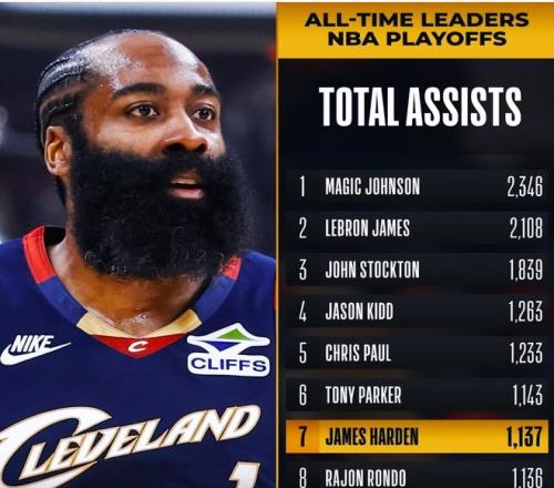 之后,哈登也迎來里程碑,為米切爾送出助攻后,哈登季后賽生涯總助攻數(shù)(1137)超越隆多(1136),升至NBA歷史第7位。