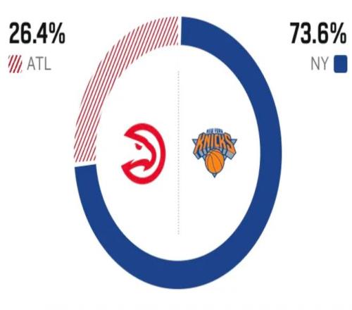 賽前,美媒ESPN對本場比賽進行了勝率預(yù)測,尼克斯勝率高達(dá)73.6% ,老鷹勝率則僅有26.4% ,對比非常明顯。