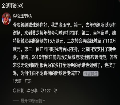 張玉寧:“骨灰級綠城球迷你好,我是張玉寧。第一,去年傷退所以沒有謝場,來到黃龍每年都會和球迷打招呼。第二,當年留洋,維特斯觸發(fā)買斷條款的15萬歐元,二次轉會再給綠城留了110萬歐元。第三,留洋回國時我有合同在身,北京國安支付了轉會費。第四,2015年留洋前的歷史綠城老球迷都應該清楚,答應宋總無論到哪里都會為家鄉(xiāng)打全運會的承諾也做到了,也挨了罵,為何任由不明真相的新球迷傳謠言?”