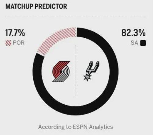 即將到來的G2,馬刺勝率高達(dá)82.3%,開拓者勝率則低至17.7%。