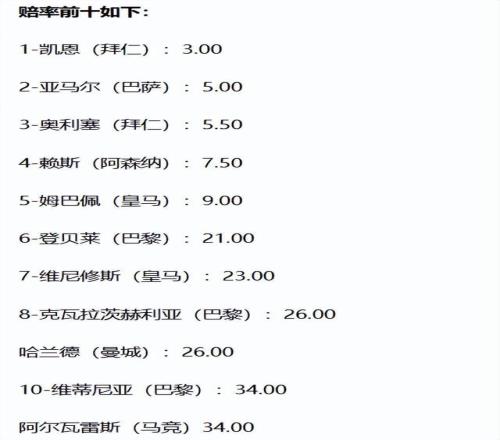隨著五大聯(lián)賽和歐冠賽事進(jìn)入最后的沖刺階段,最新一期的金球獎(jiǎng)賠率排行榜也順勢(shì)出爐,來自的拜仁的老年射手凱恩目前位居榜首,而大熱門姆巴佩卻無緣前三。巴薩球星亞馬爾雖然位居第二,但卻遭到球迷的瘋狂吐槽。