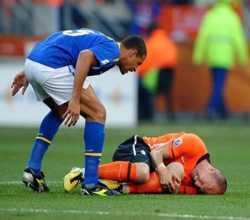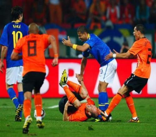 如果說(shuō)這只是意外,那接下來(lái)的操作,就是純粹的愚蠢了。當(dāng)巴西被斯內(nèi)德反超比分后,球隊(duì)急需追平。這時(shí)候,作為后場(chǎng)核心的梅洛,本應(yīng)冷靜下來(lái)組織防守,策動(dòng)反擊。可他干了什么?在一次毫無(wú)必要的拼搶中倒地后,他竟然故意踩踏已經(jīng)倒地的羅本!