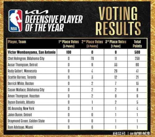 今年DPOY的三位候選人分別是文班亞馬、霍姆格倫以及奧薩爾 - 湯普森。NBA常規(guī)賽的DPOY評選,是由100名媒體記者組成的投票小組負責的,每位記者擁有3張選票,依次為第一、第二、第三選票,其分值分別為5分、3分、1分。亞馬,憑借全部100張第一選票,豪取500分。整體投票情況如下(此處可簡單提及或省略具體投票分布,保持與前文銜接)。不過,這一結果完全在大家的意料一切都是順理成章。文班亞馬此前接受采訪時就自信滿滿地表示:“要是不能全票當選,我肯定會大吃一驚。全票,必須全票!”
