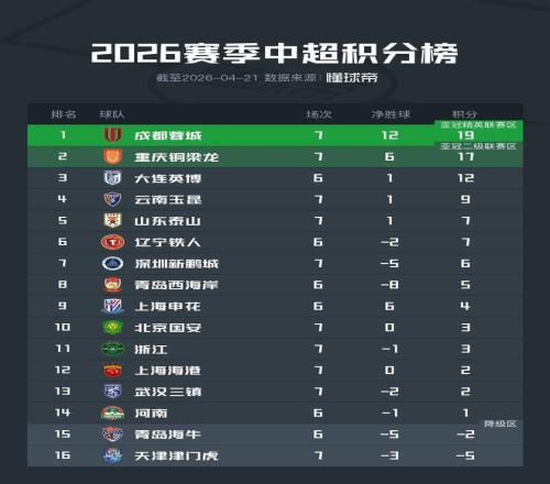 4月21日,中超第7輪先賽五場。川渝兩隊繼續(xù)領跑積分榜,山東泰山在客勝天津津門虎后升至第五,國安升至第10,浙江隊在一波四輪不勝后掉到了第11,三鎮(zhèn)則成功將積分轉正。