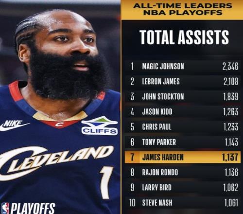 哈登季后賽總助攻數(shù)提升到1139次,超越隆多季后賽1136次助攻,升至NBA季后賽歷史助攻榜第7位。