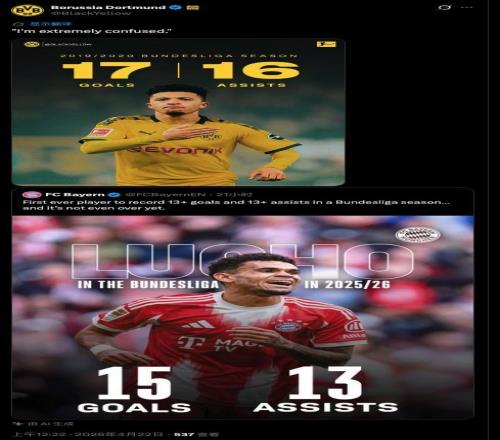 拜仁官方社交媒體曬出數(shù)據(jù)圖,稱路易斯-迪亞斯是首位單賽季德甲進(jìn)球、助攻均達(dá)到13+的球員,多特蒙德官方擺出桑喬的數(shù)據(jù)指正。