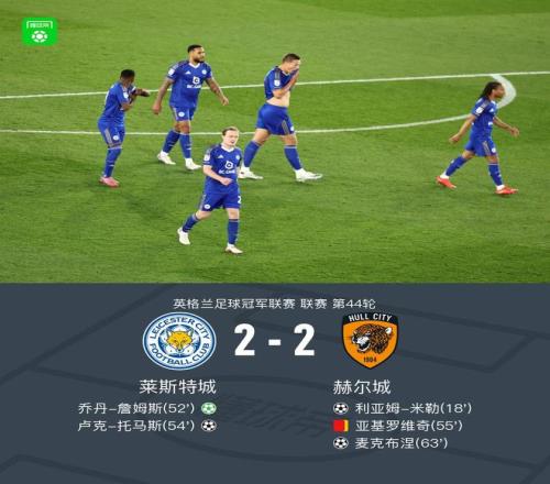 北京時(shí)間4月22日英格蘭足球冠軍聯(lián)賽 聯(lián)賽 第44輪,萊斯特城主場(chǎng)對(duì)陣赫爾城。萊斯特城喬丹-詹姆斯破門,盧克-托馬斯破門。赫爾城利亞姆-米勒破門,麥克布涅破門。最終比分萊斯特城 2-2 赫爾城。