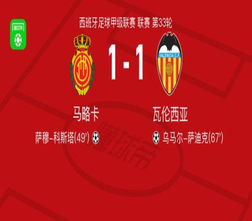 北京時間4月22日西班牙足球甲級聯(lián)賽 聯(lián)賽 第33輪,馬略卡主場對陣瓦倫西亞。馬略卡薩穆-科斯塔破門。瓦倫西亞烏馬爾-薩迪克破門。最終比分馬略卡 1-1 瓦倫西亞。