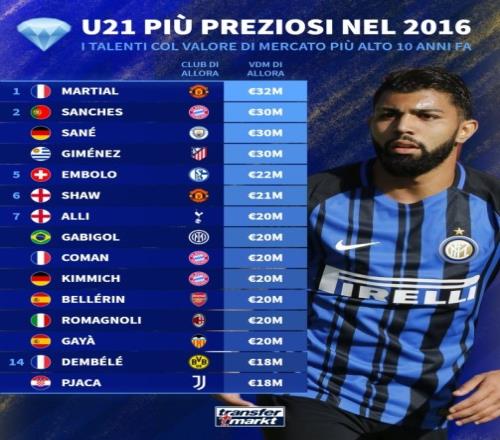 德轉(zhuǎn)列10年前U21球員身價(jià)榜:馬夏爾居首,阿里、登貝萊在列