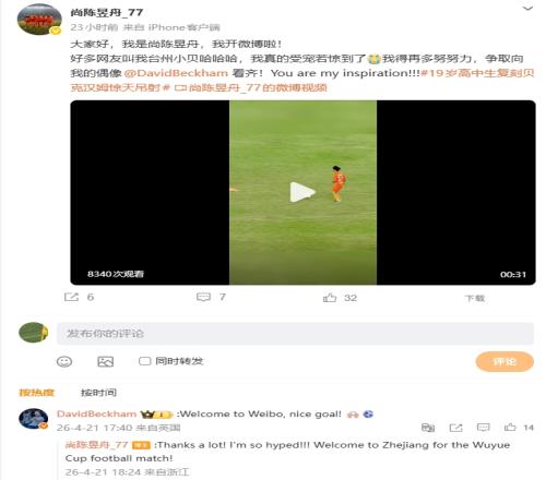 吳越杯50米吊射!“臺州小貝”開通微博,貝克漢姆本人評論歡迎