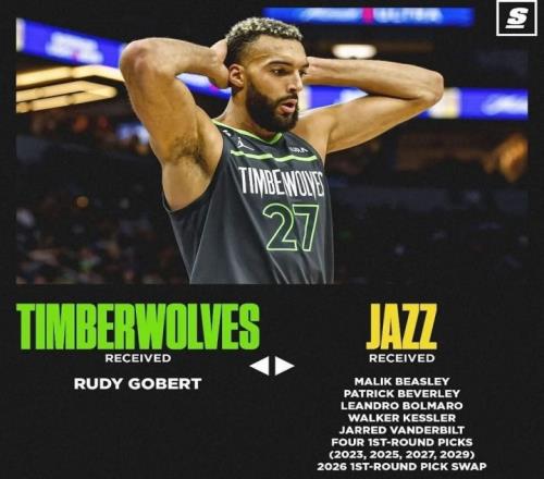 2023年夏天,森林狼送出馬利克·比斯利、貝弗利、范德比爾特、沃克·凱斯勒、博爾馬羅+4個(gè)首輪簽+1個(gè)首輪互換,整整十名球員來換取爵士的戈貝爾一人,四個(gè)首輪簽分別為2023年、2025年、2027年的無保護(hù)首輪簽和2029年前五順位保護(hù)的首輪簽,以及2026年的首輪互換權(quán)。