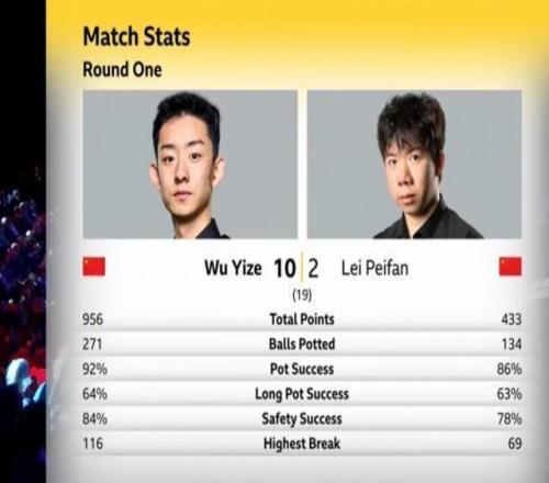 斯諾克世錦賽第一輪,吳宜澤10-2擊敗雷佩凡,晉級16強。在這場"中國德比"中,吳宜澤打出105、116分破百,以及93、92、85、67、58、68六桿50+,第一階段8比1大比分領先雷佩凡。第二階段雷佩凡扳回一局后,吳宜澤連勝兩局拿下比賽。1/8決賽吳宜澤將面對馬克·塞爾比和杰克·瓊斯之間的勝者。