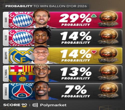 Polymarket更新了金球獎得住概率,其中凱恩升至29%,奧利塞與姆巴佩14%并列第二。