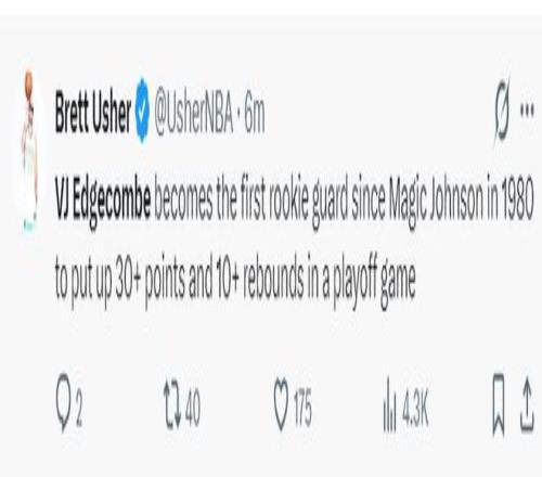 這場比賽VJ迎來生涯之夜,這是他生涯第二場季后賽,他就拿到30+的數(shù)據(jù),他直接登上了全美熱搜。
