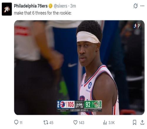 埃奇庫姆在第四節(jié)命中第六個三分球時(shí)已經(jīng)幫助費(fèi)城拉開到13分,綠凱主場死氣沉沉沒有任何的加油聲,因?yàn)榍蛎灾肋@場比賽交代了。埃奇庫姆這位新秀完成了一個王之蔑視。
