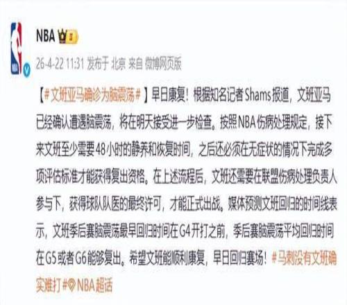 據(jù)名記SHAMS報(bào)道,文班亞馬已被確診為腦震蕩,將于次日接受進(jìn)一步神經(jīng)學(xué)評估。根據(jù)NBA聯(lián)盟規(guī)定,腦震蕩球員在受傷后48小時(shí)內(nèi)不得參與任何訓(xùn)練或比賽,復(fù)出必須通過逐級醫(yī)學(xué)評估。
