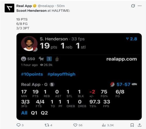北京時(shí)間4月22日,NBA季后賽,開(kāi)拓者以106-103擊敗馬刺,大比分扳成1-1。這場(chǎng)比賽斯科特-亨德森迎來(lái)了高光無(wú)限的夜晚,在球隊(duì)領(lǐng)袖阿夫迪亞狀態(tài)低迷的情況下,他挺身而出瘋狂為開(kāi)拓者取分緊咬分差,全場(chǎng)比賽31+5三分,這位2023年的探花郎終于開(kāi)始兌現(xiàn)天賦,雖然這個(gè)天賦跟文班亞馬比還是差了幾個(gè)檔次。