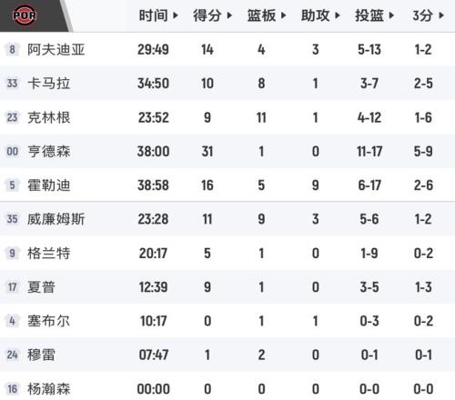 本場(chǎng)開(kāi)拓者10人獲得出場(chǎng)機(jī)會(huì),沒(méi)有楊瀚森。亨德森獨(dú)得31分,霍勒迪16分5板9助,羅威11分9板4助,克林根9分10板。塞布爾10分鐘的出場(chǎng)時(shí)間,3中0,正負(fù)值負(fù)-22,是開(kāi)拓者最大短板,還不如讓楊瀚森上場(chǎng)鍛煉一下。目前看楊瀚森的NBA第一個(gè)賽季基本結(jié)束了,因?yàn)樾罡静辉谒蛊绽氐募竞筚悜?zhàn)術(shù)計(jì)劃之內(nèi)。