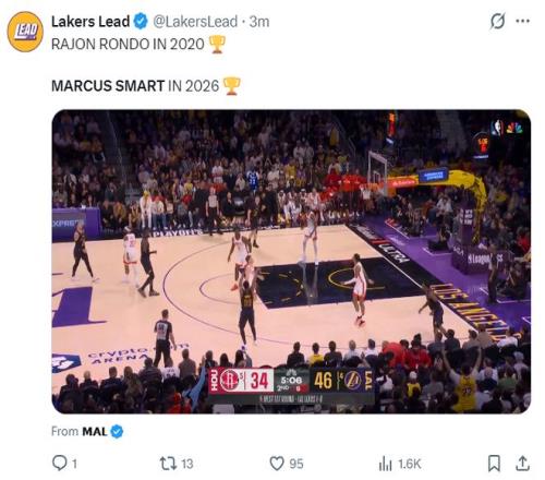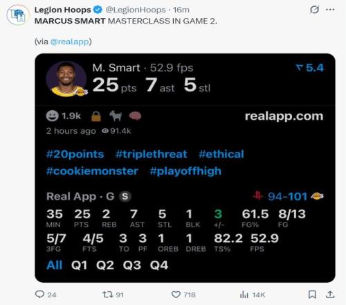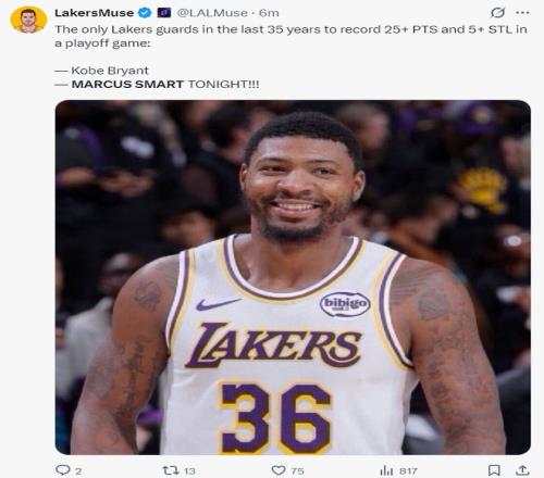 斯瑪特不僅是湖人隊史首位季后賽25+5+5三分+5搶斷的球員,他還是過去35年科比后首位拿到25+5搶斷的球員。
