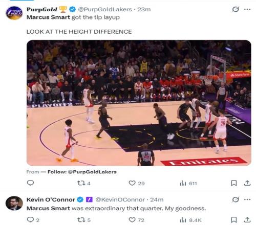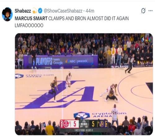 馬庫斯-斯瑪特這場比賽開場就炸裂了,他直接搶斷了杜蘭特,隨后轉(zhuǎn)換三分命中,緊接著他又搶斷成功再度三分命中,節(jié)末還幫助詹姆斯完成1+2壓哨,單節(jié)7中5+三分4中3拿到14分1籃板1助攻2搶斷。