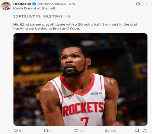 次節(jié)湖人一度拉開(kāi)到15分了,杜蘭特登場(chǎng)時(shí)他的隊(duì)友們都已經(jīng)開(kāi)始低著頭沉默不語(yǔ),KD只是淡定的進(jìn)攻、防守,他連拿5分幫助全隊(duì)激勵(lì)士氣,火箭延續(xù)一波12-0打停湖人。暫停后KD中投造犯規(guī),杜蘭特第二節(jié)也拿到9分,上半場(chǎng)7中6+罰球7中7拿到20分3籃板1搶斷1蓋帽,命中率85.7%,火箭全隊(duì)半場(chǎng)才51分。(杜蘭特第62次半場(chǎng)季后賽20+歷史第三,僅次于詹姆斯/科比)