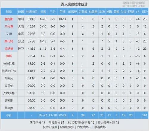 湖人從三分線外開始夾擊杜蘭特,比賽還沒(méi)結(jié)束,KD已經(jīng)8次失誤。末節(jié)最后3分鐘,杜蘭特才打進(jìn)下半場(chǎng)第一個(gè)運(yùn)動(dòng)戰(zhàn)進(jìn)球。最后1分多鐘,杜蘭特再次出現(xiàn)傳球失誤?;鸺朗劂渡?,詹姆斯暴扣殺死比賽。全場(chǎng)結(jié)束,湖人101-94戰(zhàn)勝火箭。