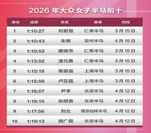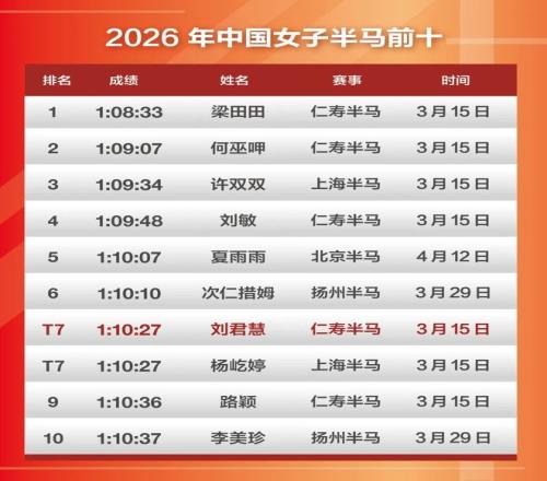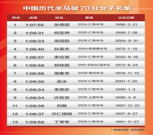 一個月前的3月15日,在最易PB的賽道仁壽半馬兩位大眾女選手劉君慧和唐曉芳首次跑到70分,率先吹響向Sub70沖擊的號角。根據(jù)世界田聯(lián)的數(shù)據(jù),中國女子半馬Sub70俱樂部的成員僅13人,其中10個成績都出自2024年之后,且9個出自仁壽半馬。在今年的仁壽,中國一姐張德順因為婚禮過后雜事纏身,錯失了向自己保持的半馬1:07:55中國最好成績沖擊的機會,只跑出了1:14:17,但全運會雙金王梁田田在自己第二年的仁壽交出1:08:33的PB,排在了2026年度中國女子半馬榜首。