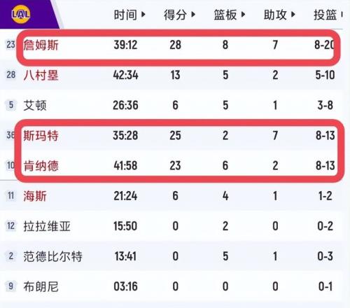全場比賽,詹姆斯登場39分鐘,21次出手命中8球,三分線外6投2中,罰球14罰10中,最終貢獻28分8籃板7助攻1搶斷的全能答卷。數(shù)據(jù)表面看似平實,可他在決定勝負(fù)走向的第三節(jié)與末節(jié)所展現(xiàn)的掌控力與決斷力,早已超越統(tǒng)計所能承載的范疇。
