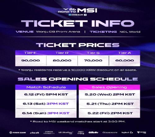 LCK發(fā)布MSI晉級賽門票:場館原州四檔F席約415rmbR席約369rmb