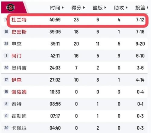 火箭一側(cè),杜蘭特全場(chǎng)斬獲23分6籃板4助攻,紙面數(shù)據(jù)尚可,卻出現(xiàn)高達(dá)9次失誤,尤其下半場(chǎng)僅得3分,成為球隊(duì)潰敗的關(guān)鍵癥結(jié);申京與小史密斯分別拿下20分與18分,終究難挽狂瀾。