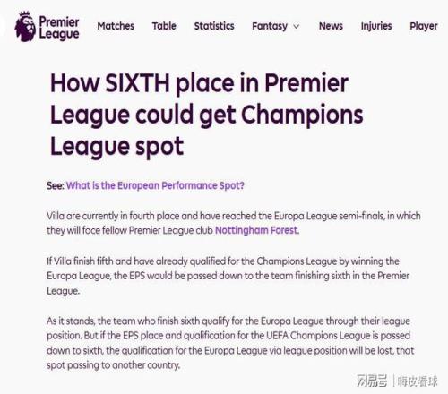 英超官網(wǎng)發(fā)布了一則消息,標(biāo)題是英超第六名,如何獲得歐冠的獎勵名額。文中首先介紹,英超已經(jīng)獲得下賽季的歐冠獎勵名額,阿斯頓維拉暫時排在聯(lián)賽第四名,將和諾丁漢森林在歐聯(lián)杯半決賽相遇。