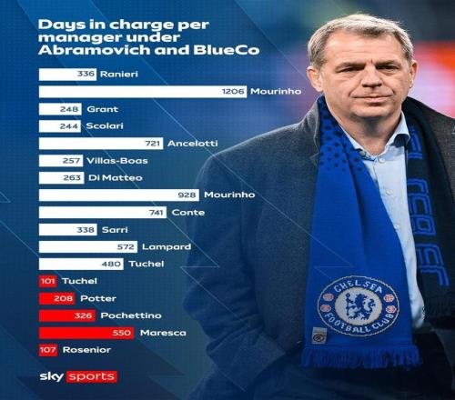 清湖資本時代切爾西歷任正式主帥在任天數(shù):