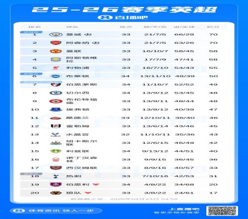 此役后,曼城積70分追平阿森納,兩隊(duì)均賽33場(chǎng)的情況下,凈勝球都是37個(gè),曼城進(jìn)球數(shù)66,阿森納進(jìn)球數(shù)63,因此曼城登頂!