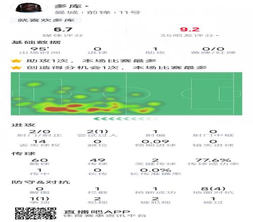 體育播報(bào)4月23日宣 在本輪英超,曼城1-0擊敗伯恩利,以下為多庫本場數(shù)據(jù):