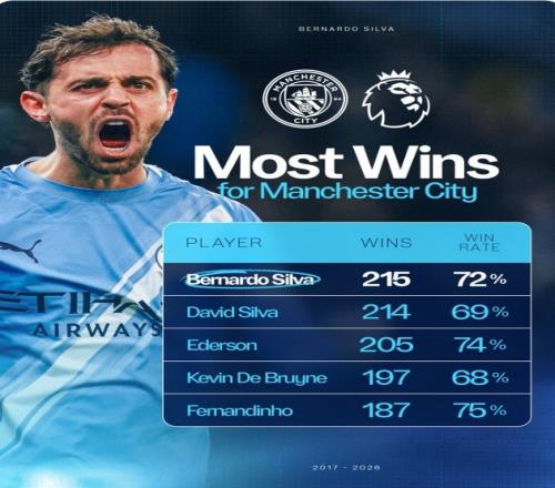 曼城隊史英超勝場數(shù)榜:B席215場超越大衛(wèi)席爾瓦居首