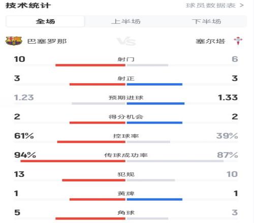 巴薩10塞爾塔全場數(shù)據(jù):射門106,射正33,控球率61%39%