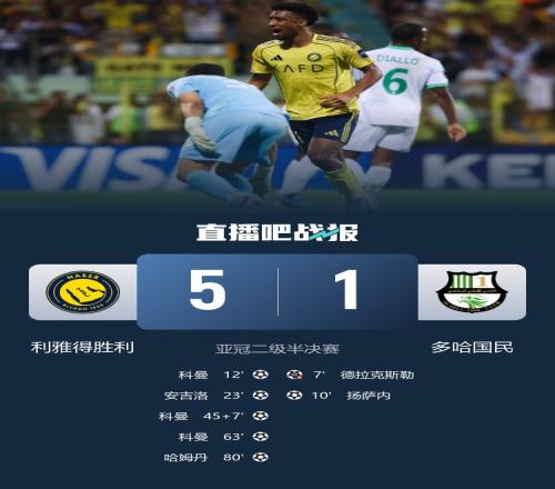 進(jìn)軍亞冠二級(jí)決賽!利雅得勝利51多哈國(guó)民科曼戴帽安吉洛1射3傳