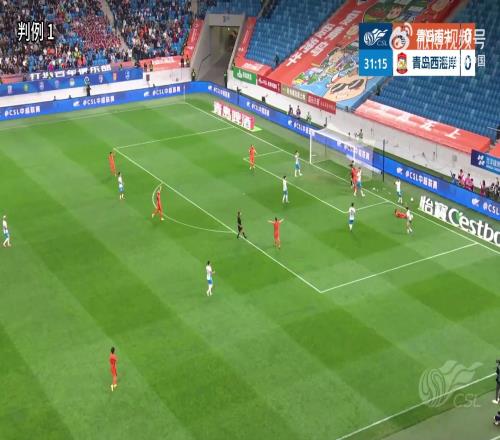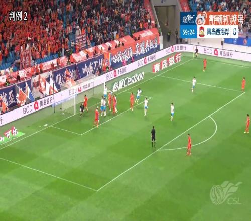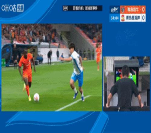 判例二:中超聯(lián)賽第6輪,青島海牛VS青島西海岸。比賽第60分鐘,青島西海岸23號隊員在本方罰球區(qū)內(nèi)疑似手臂觸球。裁判員未判罰手球犯規(guī), VAR未介入。