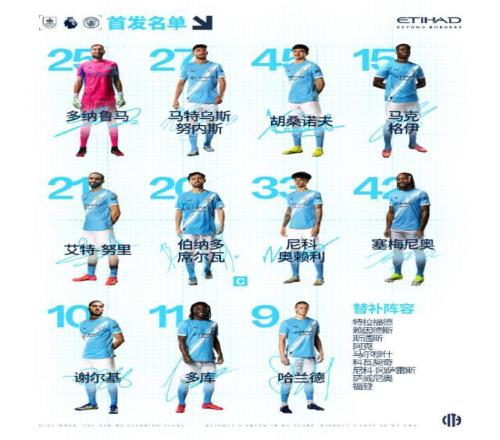 曼城陣容(4231):唐納魯馬/努內(nèi)斯、胡桑諾夫、格伊、努里(65’尼科·岡薩雷斯)/貝爾納多·席爾瓦、奧賴利/塞梅尼奧(65’薩維尼奧)、謝爾基、多庫/哈蘭德