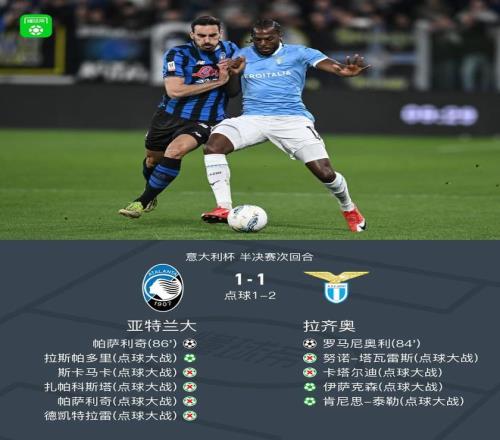 北京時間4月23日意大利杯 半決賽次回合,亞特蘭大對陣?yán)R奧。亞特蘭大帕薩利奇破門。拉齊奧羅馬尼奧利破門。最終比分亞特蘭大 2-3 拉齊奧。兩回合總比分亞特蘭大4-5拉齊奧。