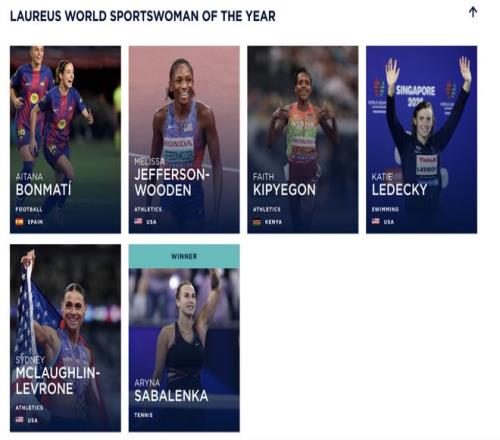 這份榮譽的分量,也來自對手的高度。本屆提名陣容同樣星光熠熠:三屆金球的 女足選手邦馬蒂、奧運冠軍兼田徑世界紀錄保持者西德尼·麥克勞克林-勒弗隆和費斯·基普耶岡,女子短跑三冠王梅麗莎·杰斐遜-伍登,以及首位在世錦賽800米自由泳項目上實現(xiàn)七連冠的游泳運動員凱蒂·萊德基。