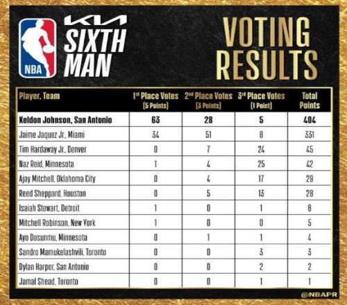 NBA官方宣布,馬刺球員凱爾登·約翰遜當選年度最佳第六人。