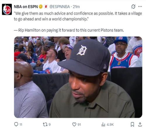 漢密爾頓在場(chǎng)邊談到這場(chǎng)勝利,他表示:我盡可能的給他們提供建議與信心,我告訴他們要贏得總冠軍需要整個(gè)團(tuán)隊(duì)的齊心協(xié)力,將這種精神傳承給如今的底特律活塞。
